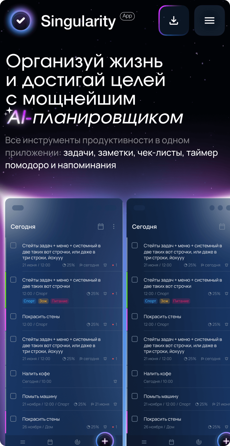 Возможностей у Сингулярити очень много. А мы любим и умеем про них рассказывать (можем делать это почти бесконечно). Но пользователю надо было показать их компактно, с акцентом на самых «вкусных». Иначе он просто устанет и потеряет фокус. Поэтому для демонстрации возможностей приложения на главной странице сайта нам пришлось использовать сразу несколько приемов.